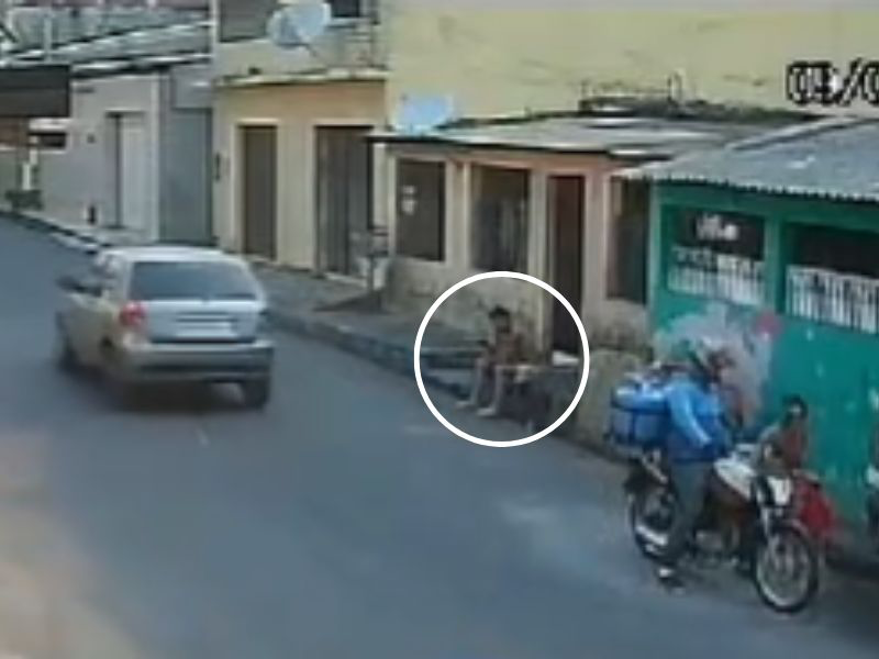 Nas imagens, é possível ver o momento em que o homem se encontra sentado na calçada, em frente a uma residência, quando um carro se aproxima e para um pouco a sua frente. O pistoleiro, de camiseta vermelha, desce do veículo já atirando, enquanto corre em direção à vítima.