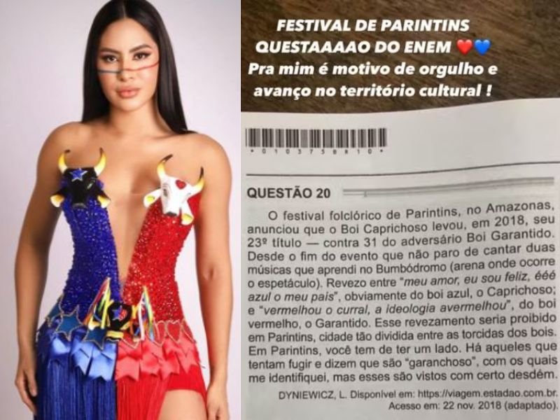 Isabelle Nogueira, ex-participante do Big Brother Brasil 24 e representante da Cunhã-Poranga do Boi Garantido, celebrou a novidade direto de Madri, na Espanha. Ela compartilhou sua felicidade nas redes sociais, destacando o orgulho pela inclusão do festival no Enem. “FESTIVAL DE PARINTINS, QUESTÃO DO ENEM! Pra mim é motivo de orgulho e avanço no território cultural!”, escreveu Isabelle em um Story no Instagram, acompanhado de uma foto da questão.