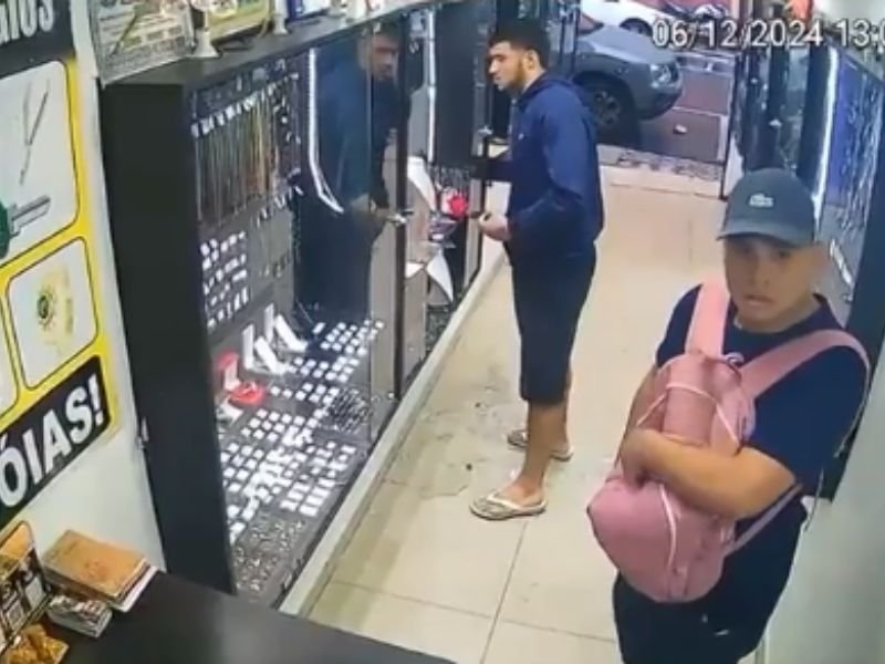 Nas imagens, os suspeitos aparecem rendendo um idoso na entrada da joalheria e o obrigam a permanecer próximo a uma funcionária. Em seguida, a dupla quebra os vidros dos expositores e coloca diversas joias, incluindo colares e outros itens de alto valor, em mochilas.