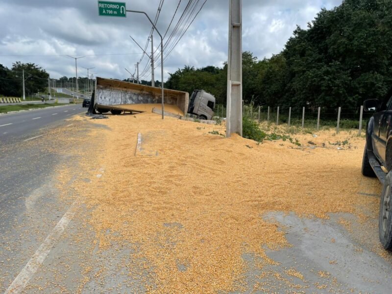 Veja Fotos: Carreta carregada de milho tomba no Tarumã e atrapalha trânsito