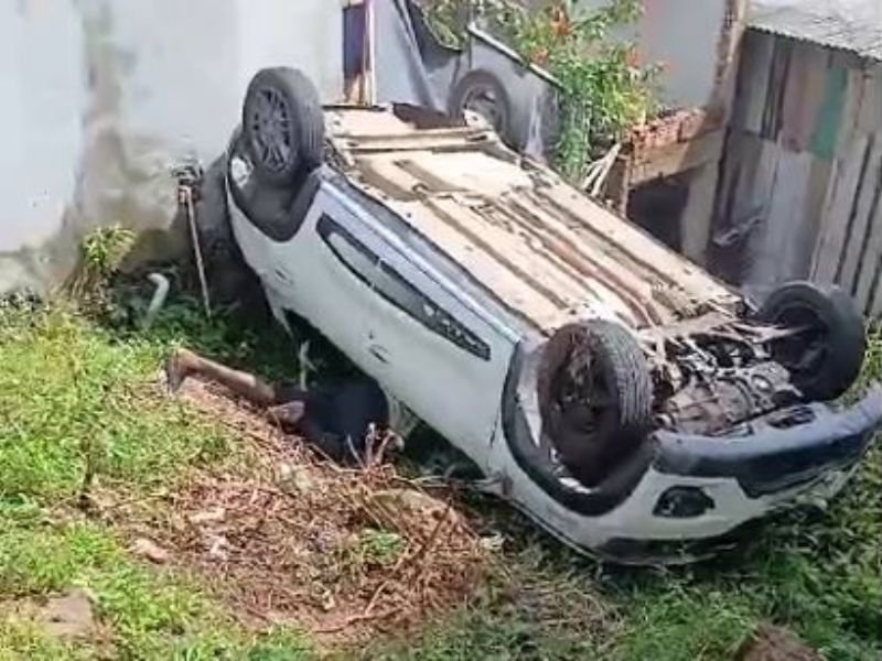 O carro saiu da pista e tombou em um terreno baldio, próximo a residências da área
