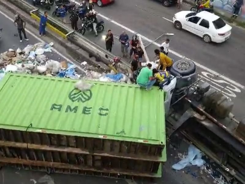 Manaus (AM) – Um acidente que ocorreu na tarde desta terça-feira (28), envolvendo uma carreta de lixo interrompeu parcialmente o tráfego na Avenida das Flores, próximo ao cruzamento com a Avenida Arquiteta Angélica Cruz, no Conjunto Nova Cidade, zona norte de Manaus. O veículo perdeu o controle, atingiu o meio-fio e tombou, espalhando lixo pela pista.