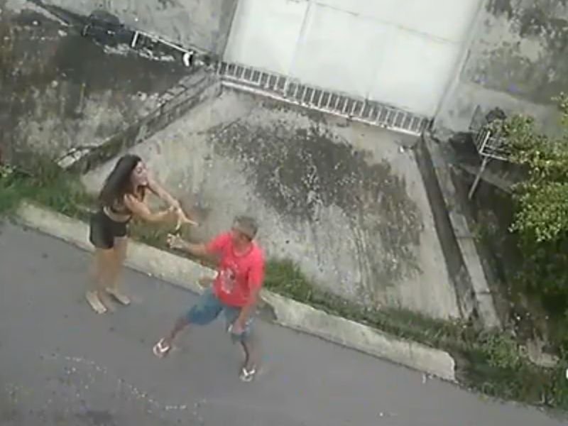 Nas imagens, é possível ver os dois discutindo na rua. Em determinado momento, Elias saca uma tesoura e avança contra a vizinha, atingindo-a com pelo menos dois golpes. A agressão só não teve um desfecho ainda mais trágico porque uma moradora interveio, conseguindo afastar o agressor, enquanto outro residente da área ajudava a vítima ferida.