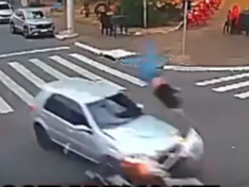 As imagens mostram o momento exato em que a moto, de baixa cilindrada, ultrapassa o semáforo fechado e atinge um veículo que trafegava corretamente pela via. Com o impacto da colisão, o motociclista foi arremessado ao solo.