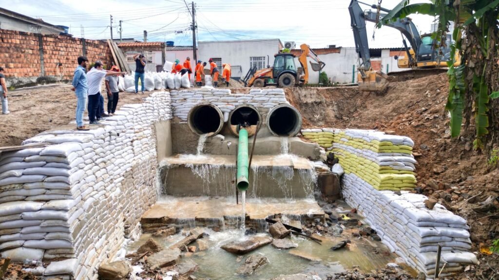 No Parque 10 de Novembro, zona Centro-Sul, a obra é mais estrutural: a recomposição de uma rede de drenagem de três linhas de 1,5 metro de diâmetro, que havia cedido após as fortes chuvas. A Seminf concluiu a substituição dos tubos por uma nova tubulação de concreto armado e agora avança com a proteção do talude com rip-rap, construção de escada hidráulica e dissipador de energia da água. A recomposição completa da rua, com asfalto, calçada e meio-fio, ocorrerá em seguida.
