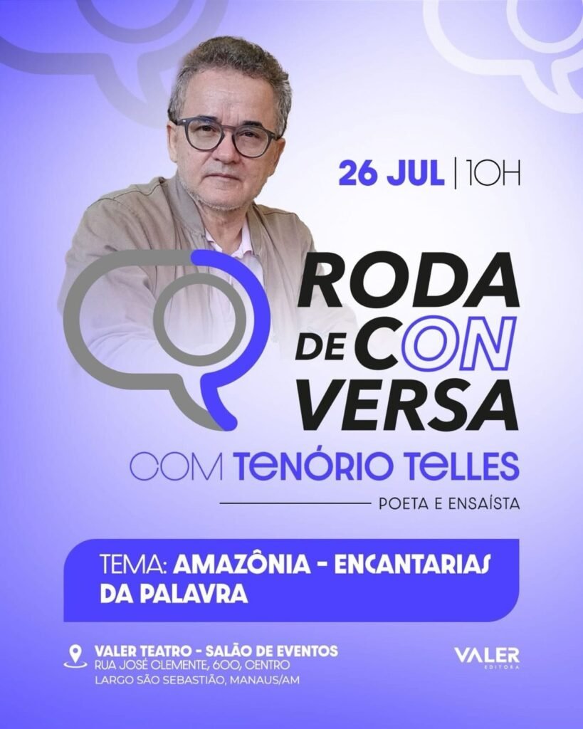 Segundo a professora doutora em Filosofia Neiza Teixeira, coordenadora editorial da Valer, para esse ciclo do Roda de Conversa estava faltando o espaço da literatura produzida no Amazonas e nada mais significativo do que trazer Tenório Telles, que é um escritor, professor, editor e pesquisador com forte atuação na cultura e literatura brasileira.
