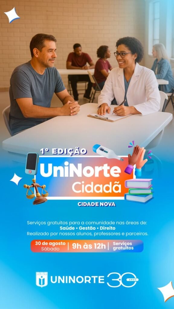 No dia 30 de agosto, a UNINORTE realiza a primeira edição do “UNINORTE Cidadã”, uma ação solidária que promete transformar a manhã de centenas de moradores da zona Centro-Sul e Norte de Manaus. O evento acontece das 9h às 12h, nos campus Djalma Batista e Cidade Nova, e tem como objetivo levar à população serviços gratuitos e de qualidade nas áreas de Saúde, Direito, Gestão, Arquitetura, Tecnologia, entre outras. Os alunos e professores da Instituição de Ensino Superior (IES) participam da iniciativa.