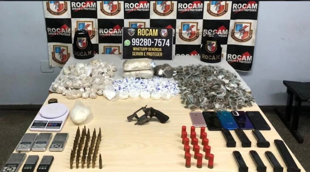 No local, os policiais apreenderam uma grande quantidade de entorpecentes, incluindo mais de 5 mil porções de oxi, além de cocaína e maconha, todas já fracionadas para a venda. Também foram encontrados um revólver calibre 38, munições, carregadores de diferentes calibres, balanças de precisão, câmeras de vigilância e cadernos com anotações que podem estar ligadas à atividade criminosa.